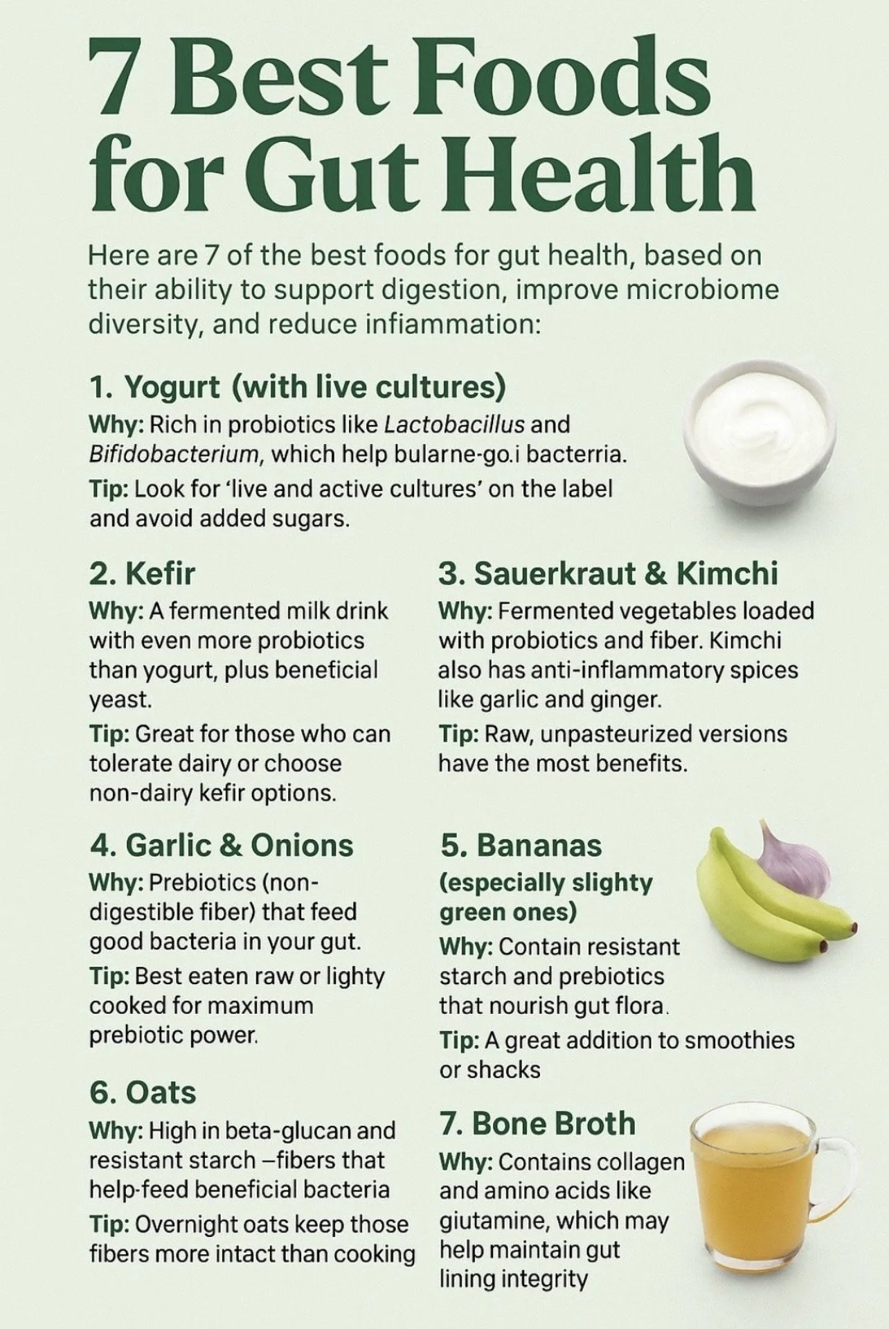 Here are 7 foods I keep coming back to that are simple, gut-friendly, and actually doable in real life: